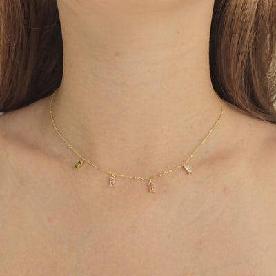 Stellar necklace features a graceful array of baguette-cut stones in soft pastel hues - each one a subtle accent that catches the eye.